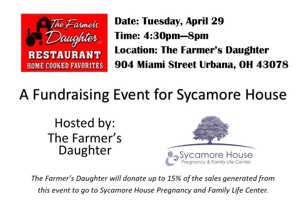 On April 29th, we enjoyed a home-cooked meal and percentage did go back to Sycamore House. The Farmer’s Daughter opened up on Tuesday evening just for the fundraising event! We had a great attendance and brought in almost $900 which included donations given to us by putting Blessing in a Bottle baby bottles on the tables. We thank God for all your support and joining us that evening!