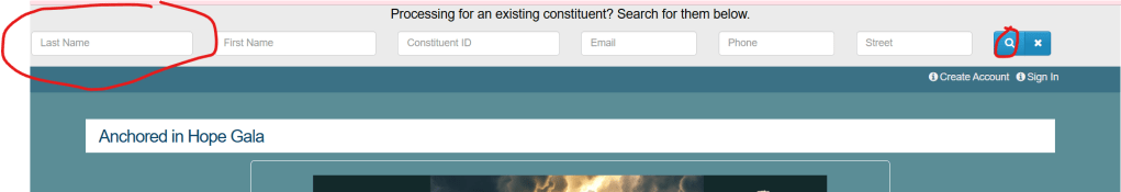 *If you feel you have donated before to Sycamore House, you are most likely in our system called, DonorView, so when you register online and click on the button or link to Register: https://app.dvforms.net/api/dv/vy24ej. First thing you do, you look for the top left and put in your last name (which is circled red) and click on the search button which is the magnified glass that is circled below in red, your name will pop up and just click on your name and it will fill in your information for you. You can click on Pay later (to pay check or cash) or pay by credit card.